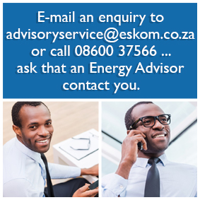 Eskom's Energy Advisors specialise in advice on how you can lower your energy use and, as a result, reduce your business' operating costs. Email an enquiry to AdvisoryService@eskom.co.za or call 08600 37566, and ask that an advisor contacts you. Read more