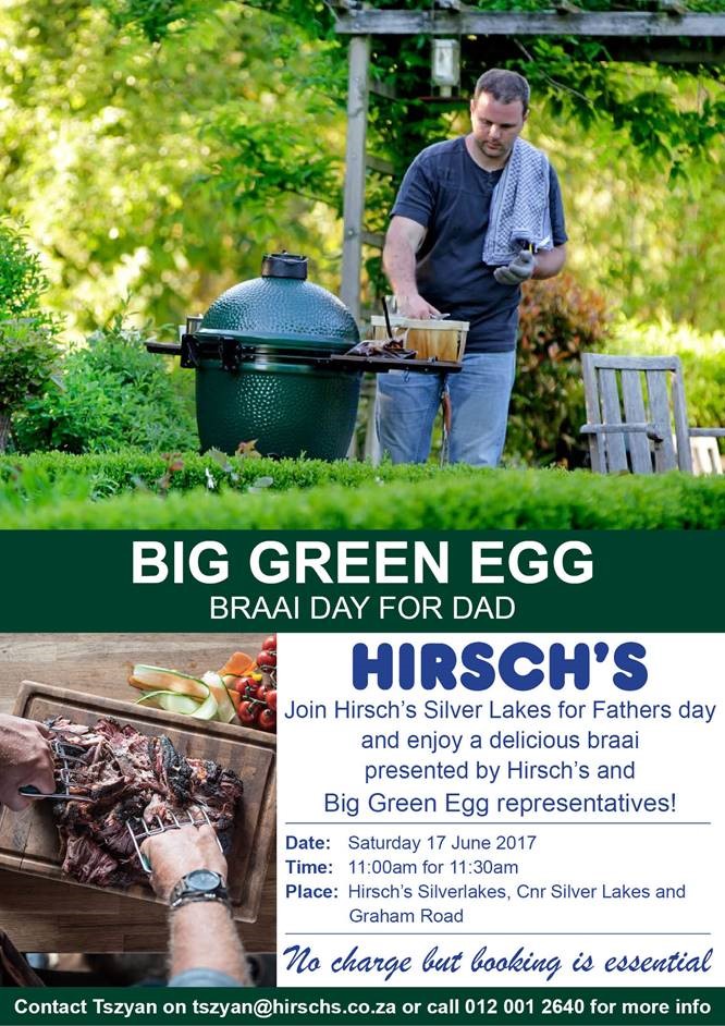 Join Hirsch’s Silver Lakes for Fathers day and enjoy a delicious warm braai with one of the Big Green Egg representatives!