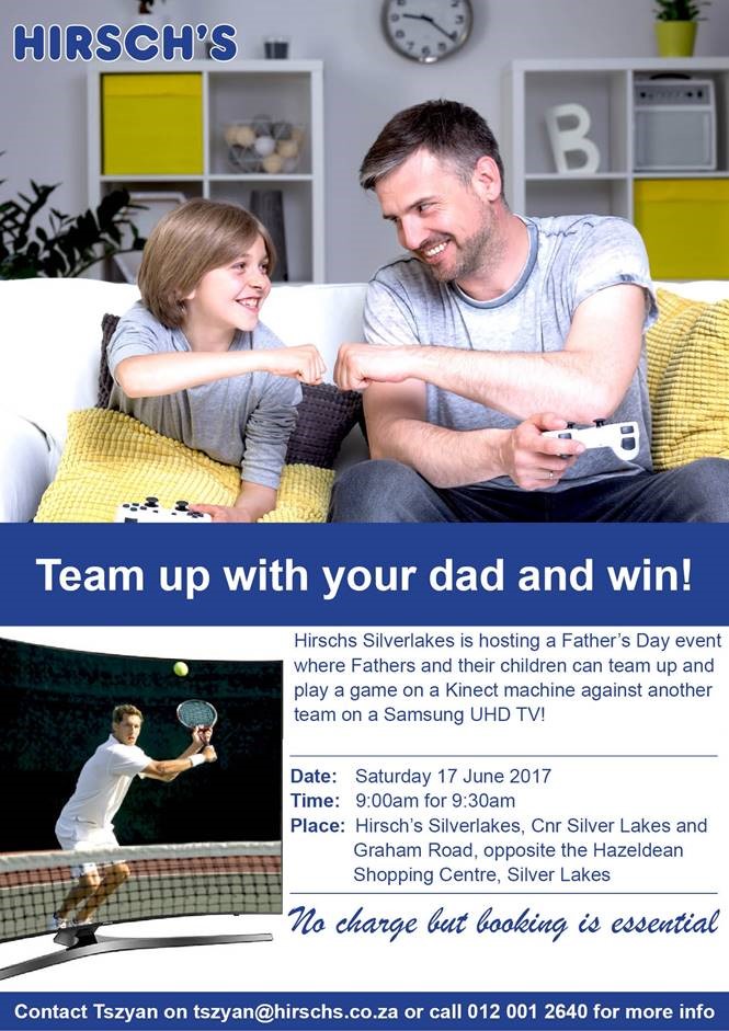 Hirschs Silverlakes is hosting a Father's Day event where Fathers and their children can team up and play a game on a Kinect machine against another team on a Samsung UHD TV!
