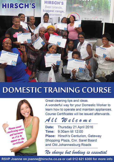 FREE DOMESTIC WORKERS COURSE – AND HOUSEHOLD TIPS AT HIRSCH’S CENTURION