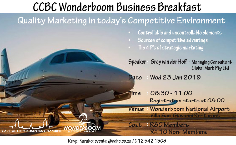 The Capital City Business Chamber (CCBC) is an innovative organization working for the success of the Business Community in the Capital City (Pretoria/Tshwane) of South Africa