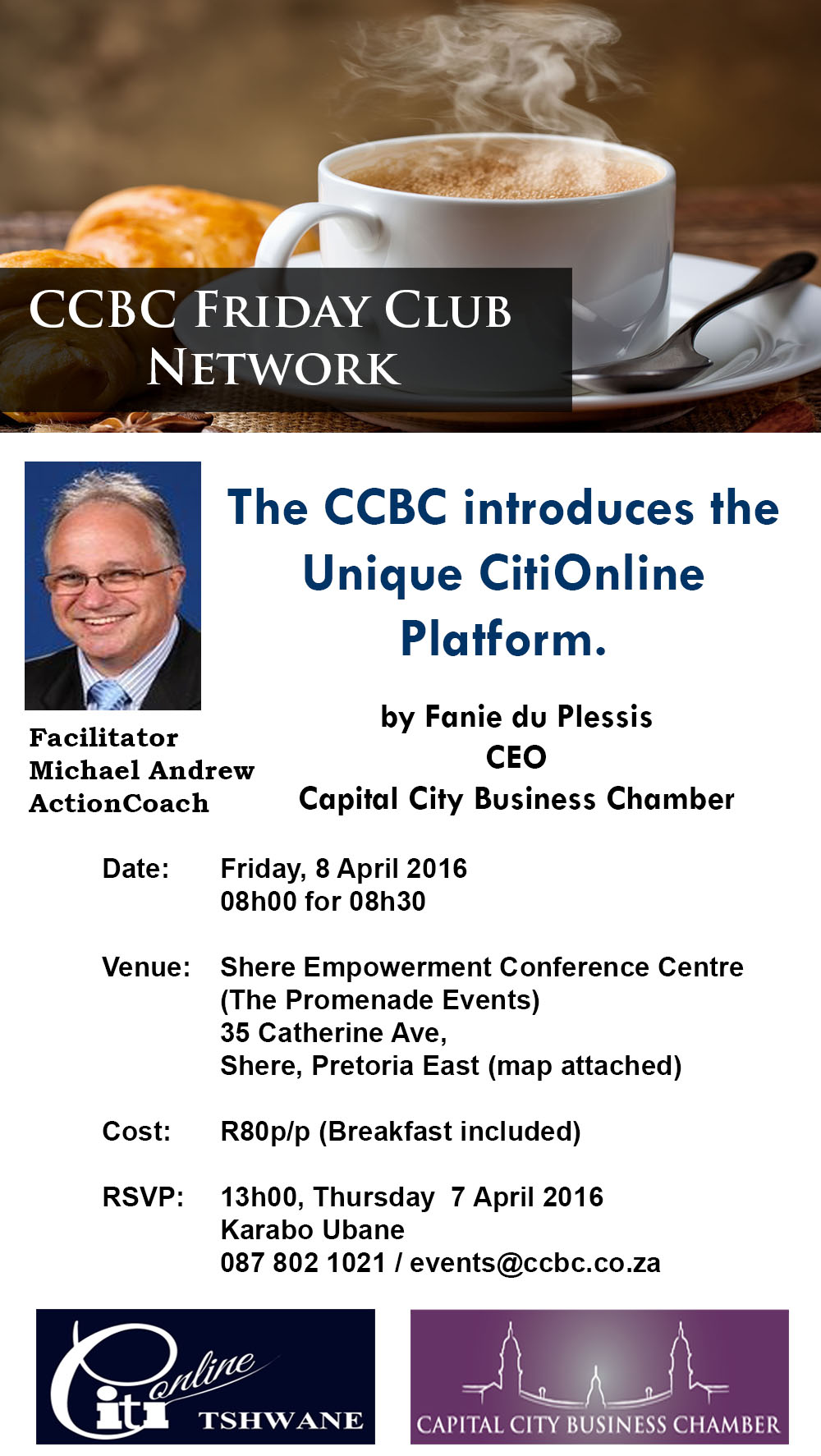 The Capital City Business Chamber (CCBC) is an innovative organization working for the success of the Business Community in the Capital City (Pretoria/Tshwane) of South Africa