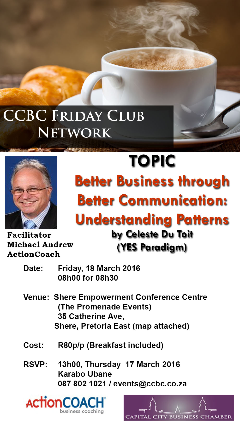 The Capital City Business Chamber (CCBC) is an innovative organization working for the success of the Business Community in the Capital City (Pretoria/Tshwane) of South Africa