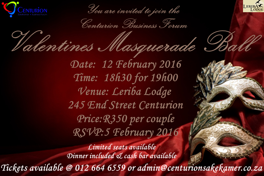 Please see invitation below the Centurion Business Forum “ Valentines Masquerade Ball” at Leriba Lodge on Friday 12th February 2016